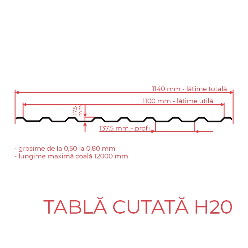 Tabla cutată H20 este un profil metalic cu o înălțime a cutei de 20 mm, ideal pentru acoperișuri, fațade, garduri și diverse lucrări de închidere în construcții rezidențiale și comerciale. Datorită greutății reduse și montajului simplu, este o soluție practică și eficientă pentru suprafețe medii sau mici. Fabricată din tablă zincată prevopsită, tabla H20 oferă rezistență la coroziune, o bună rigiditate și este disponibilă într-o varietate de culori și dimensiuni, adaptabile oricărui tip de proiect.